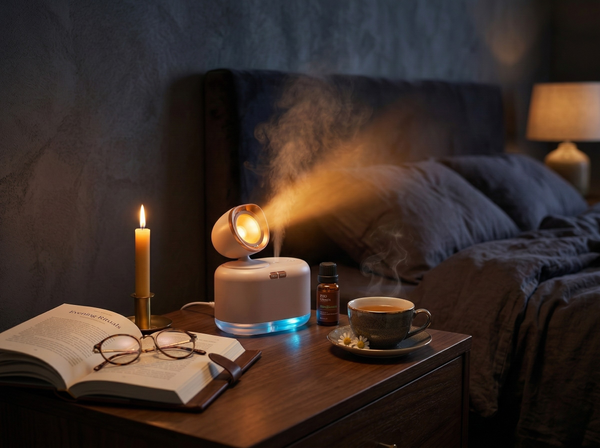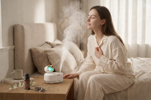 3–5 drops into your LUMRA Glow with water. Fill any room within minutes — bedroom, office, bathroom.
